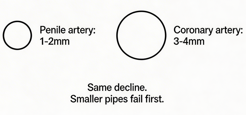 The blood vessels in your penis are 1-2mm wide. The blood vessels in your heart are 3-4mm wide. Same system. Same decline. Different size pipes.
